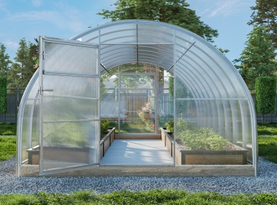 Теплица Надёжная ЭКО – экономичный вариант стандартной теплицы шириной три метра. Высота ее составляет 2 метра, а длина увеличивается кратно двум метрам: 4, 6, 8, 10 и более метров, насколько требуется покупателю. Модульный принцип сборки теплицы через болт-гайку никак не ограничивает наращивание длины теплицы. Каркас такой модели изготавливается из оцинкованной внутри и снаружи профильной квадратной замкнутой трубы сечением 20х20, имеет заводской электросварной шов. Болтовое соединение крепкое, надежное и простое: все отверстия для сборки каркаса наносятся на заводе, весь необходимый крепеж прилагается, поэтому остается просто стягивать детали каркаса в единое целое при помощи шуруповерта (никакого дополнительного специализированного строительного инструмента не требуется). В комплекте всегда идет подробная инструкция, что позволяет избежать сложностей при самостоятельном монтаже. Говоря о болтовом соединении, отметим так же, что оно предусматривает зазор между поликарбонатом и направляющими (к несущим дугам поликарбонат прилегает плотно). Это расстояние многие оценивают как преимущество, потому что просто организовать систему подвязок растений внутри теплицы: не приходится ничего дополнительно придумывать, тем более сверлить каркас.